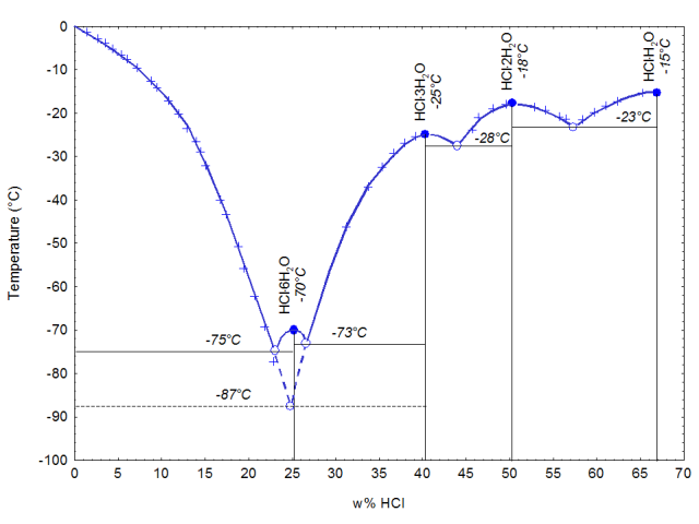 如下圖所示,鹽酸共有四個結(jié)晶的共熔點,分別對應(yīng)四種晶體:68%(HCl的質(zhì)量分?jǐn)?shù),下同)時的HCl·H2O、51%時的HCl·2H2O、41%時的HCl·3H2O和25%時的HCl·6H2O。另外在24.8%時還有一種亞穩(wěn)的HCl·3H2O生成。
