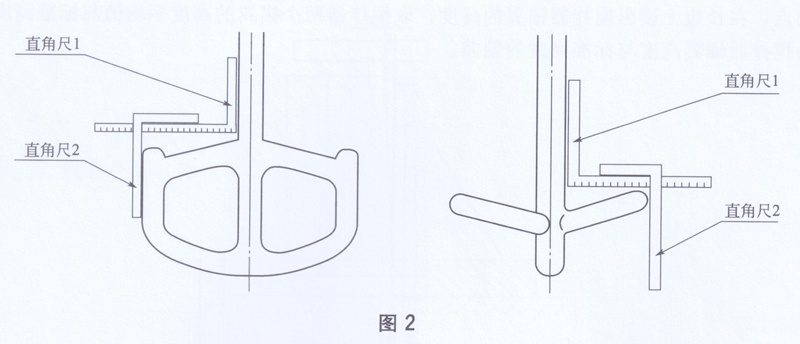 將待測(cè)攪拌器放平或豎直,如圖2所示,直角尺1的一邊貼靠在攪拌器上,另一邊與直角尺2的一邊平行貼靠,直角尺2的一邊觸碰到錨翼的端部,在直角尺1上讀取錨翼寬度值(這個(gè)值應(yīng)為錨翼端部距攪拌器軸面的最小值)。在攪拌器的另一錨翼做相同測(cè)量。對(duì)稱錨翼的錨翼寬度最大值與最小值的差為攪拌器錨翼對(duì)稱度。