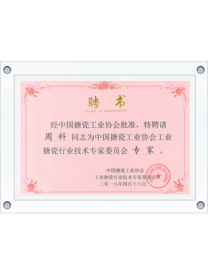 中國搪瓷工業(yè)協(xié)會專家聘書