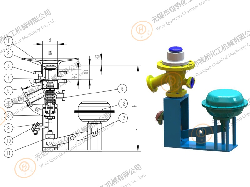 搪玻璃上展式自動放料閥(側(cè)向執(zhí)行機(jī)構(gòu)) *內(nèi)置測溫氣動放料閥