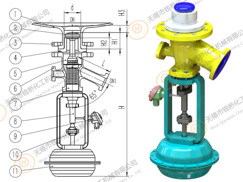 Bottom outlet valve (65°) gap free with pneumatic actuator.搪玻璃上展式自動放料閥 *內(nèi)置測溫氣動放料閥Can not be used for liquids containing fluoride ions (such as hydrofluoric acid, etc.), nor can it be used for strong alkalis and concentrated phosphoric acid with a temperat